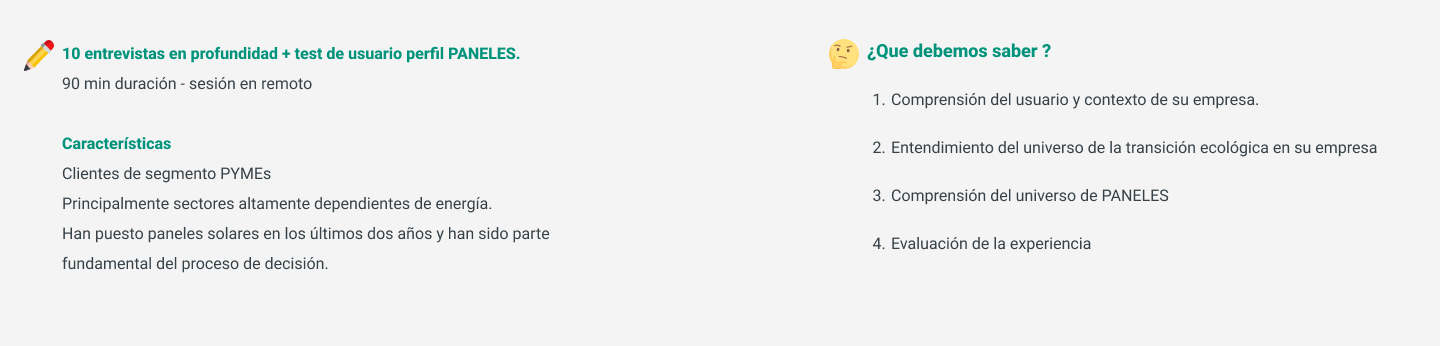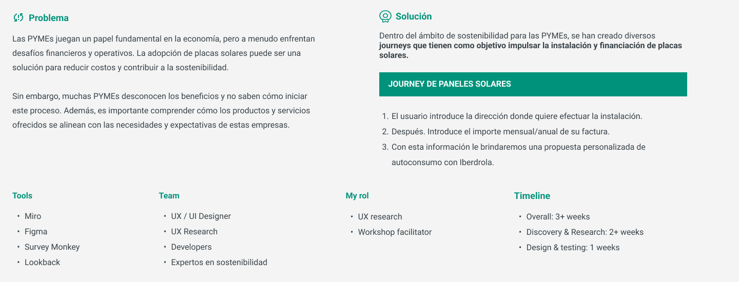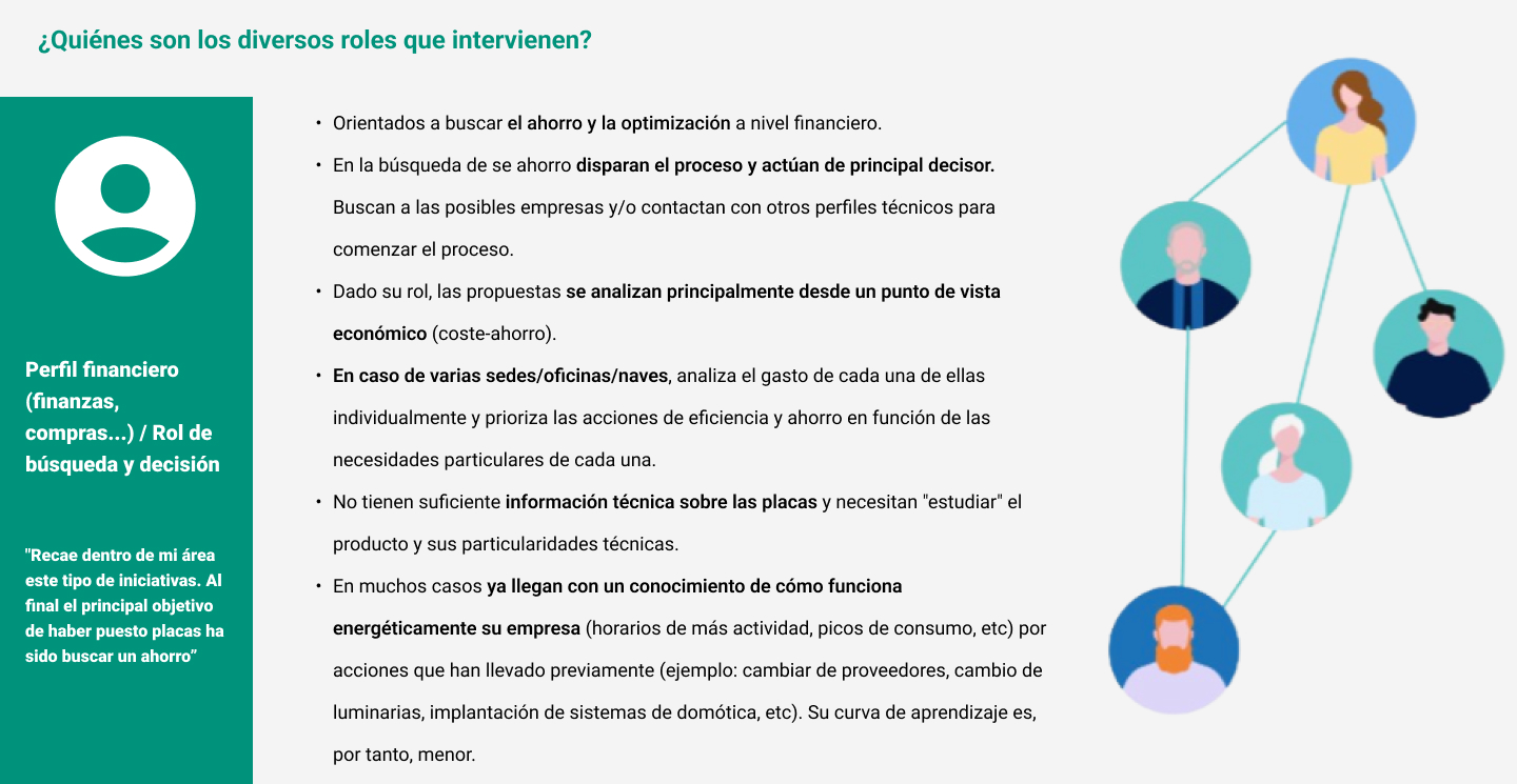 Incluyendo diez entrevistas en profundidad y encuestas en línea con representantes de PYMEs para comprender sus necesidades y perspectivas en relación con la sostenibilidad y la adopción de paneles. Con la información obtenida creé diferentes perfiles de usuarios.