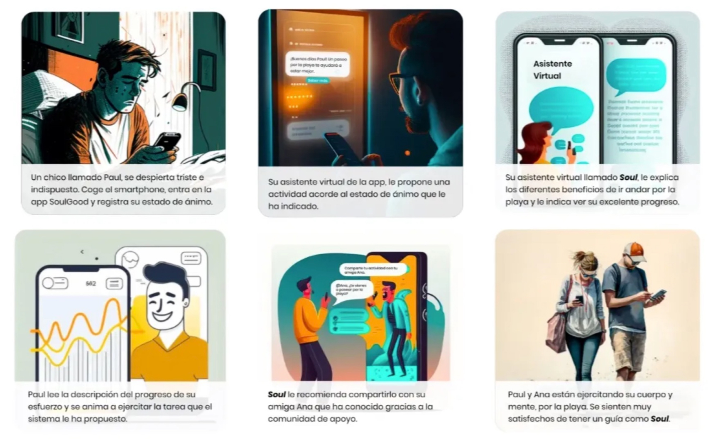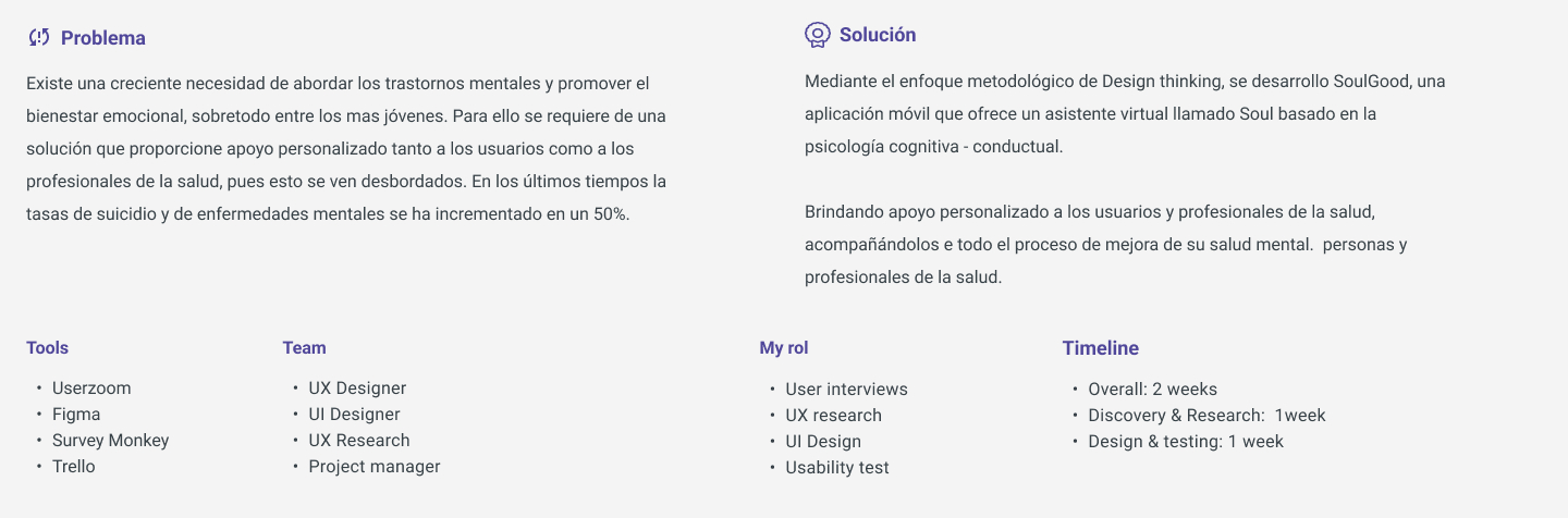 "SoulGood, es una una app que busca garantizar el bienestar emocional con un asistente virtual, SOUL basado en la psicología cognitiva - conductual. Soul puede ofrecer apoyo personalizado tanto a los usuarios que estan en esta situación, como a los profesionales de la salud, con el objetivo de acompañar en todo el proceso".