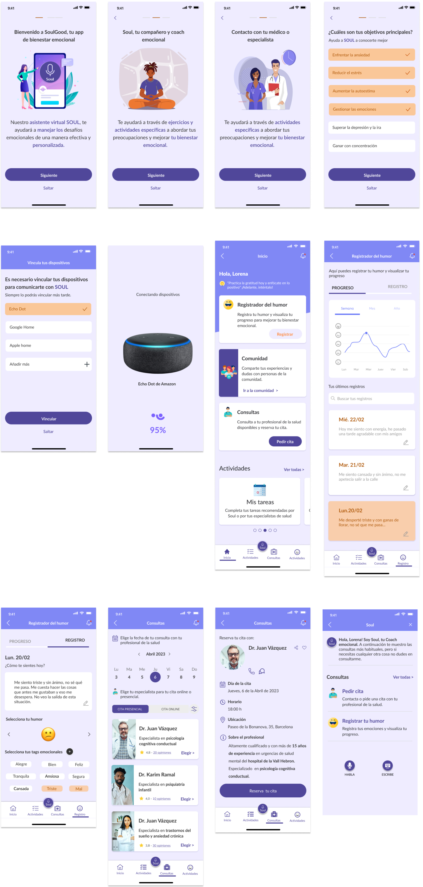 wireframes y propuestas de diseño de la interfaz de usuario. Se optó por tonos morados, que transmiten calma y tranquilidad.