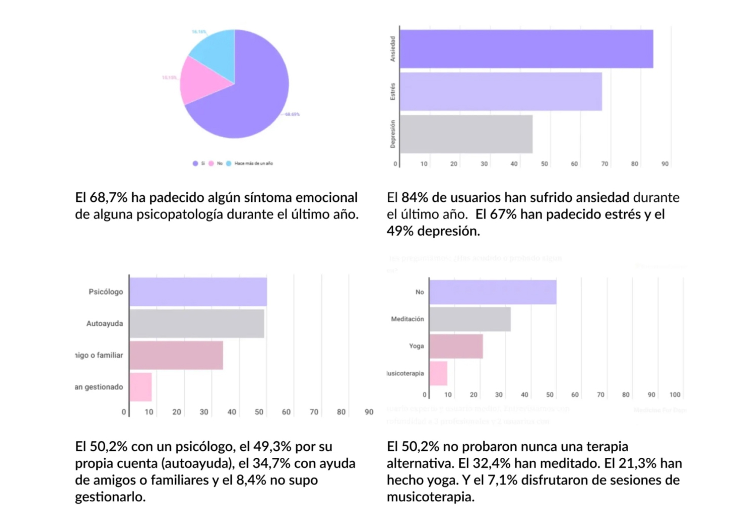 Benchmarking: infografía y webgrafía, analicé España, Portugal, Finlandia y Holanda como países con mayor y menor índice de trastornos mentales. Realicé una investigación secundaria, donde leí y analicé publicaciones en línea de distintas fuentes científicas, como artículos, investigaciones y estadísticas públicas sobre salud mental, para comparar algunos parámetros.