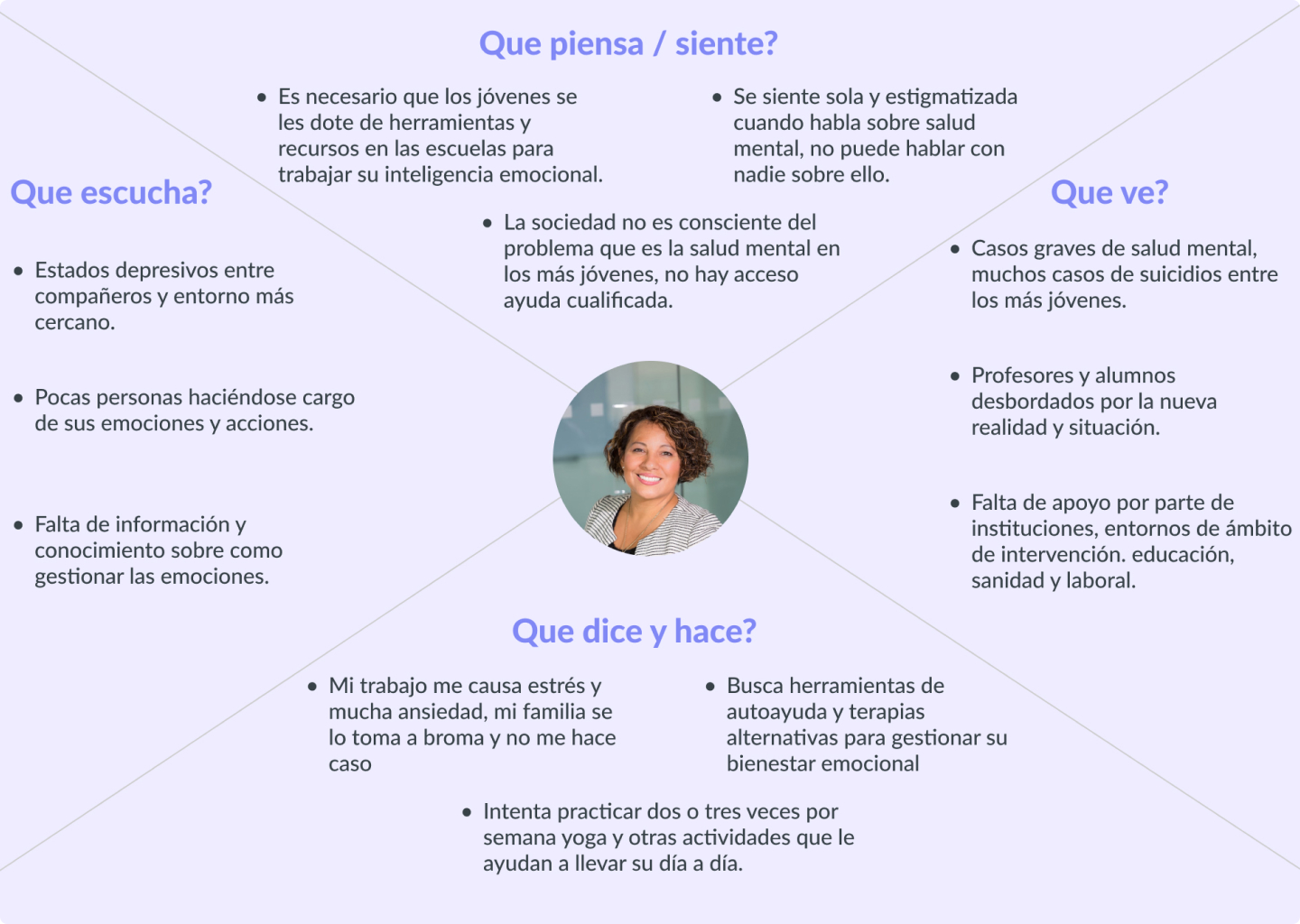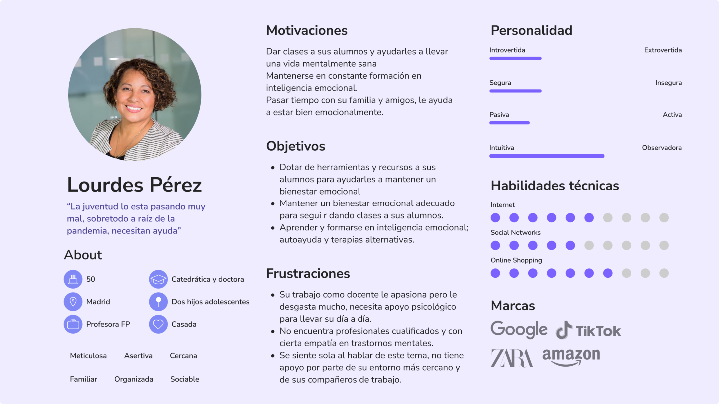 Con la intención de reafirmar los patrones de comportamiento que encontré en las entrevistas y las encuestas, creé un user persona, además de un mapa de empatía, para conseguir completar la percepción del usuario y entenderlo mejor.