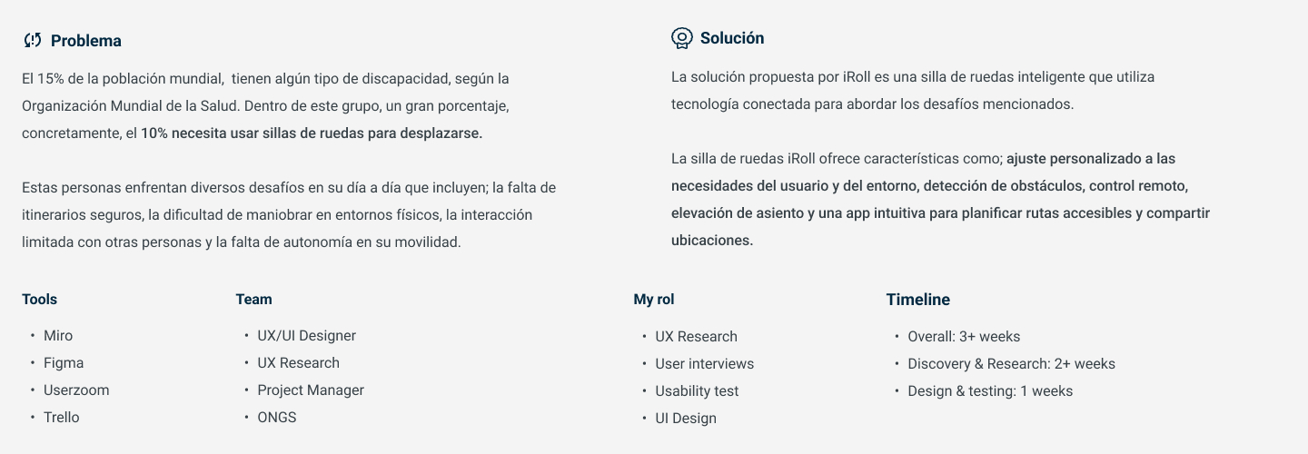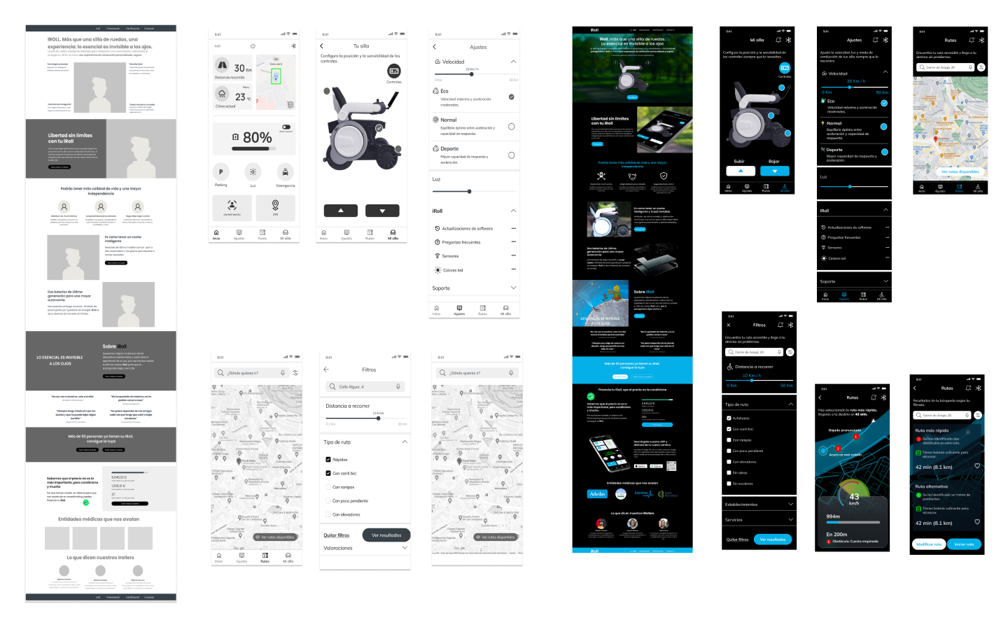 Creé lapropuesta de valor: una silla eléctrica inteligente conectada a un dispositivo móvil mediante bluetooth, que se ajusta a las necesidades del usuario y del entorno, proporcionando información sobre la duración de la batería y ayudando a superar obstáculos físicos, aquí nace iRoll, con ello la Landing y APP de nuestro producto. Ideé un storyboard para reforzar la propuesta de valor y aplicarla en un escenario.
