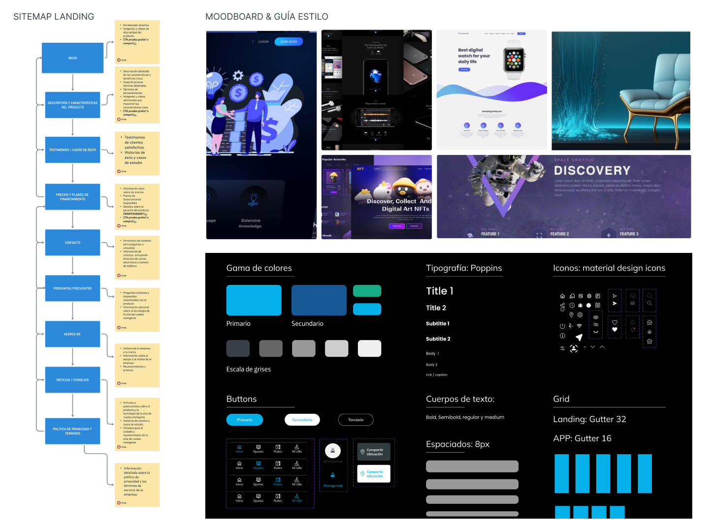 Construí la arquitectura de la información para visualizar como se iba a estructurar la Landing y app. Además de pensar en el estilo y estética que le queria dar en la Landing y app del producto.